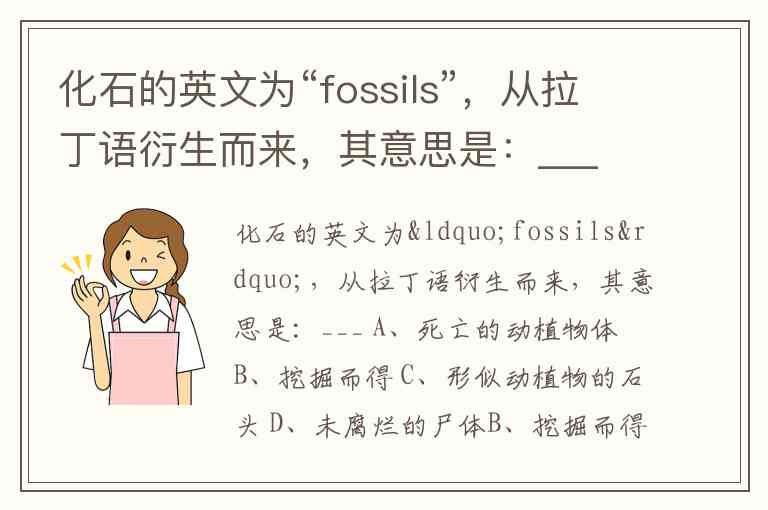 化石的英文为“fossils”,从拉丁语衍生而来,其意思是:___ A、死亡的动植物体 B、挖掘而得 C、形似动植物的石头 D、未腐烂的尸体