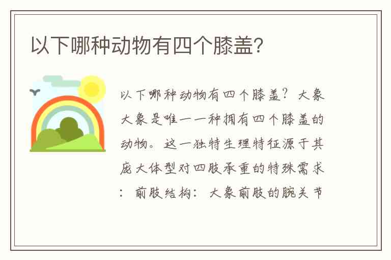 大象是唯一一种拥有四个膝盖的动物。这一独特生理特征源于其庞大体型对四肢承重的特殊需求: