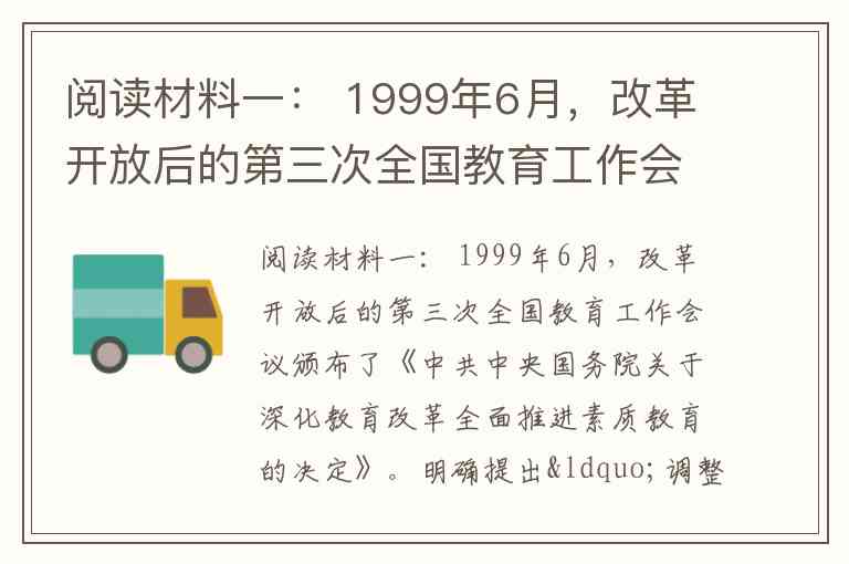 阅读材料一: 1999年6月,改革开放后的第三次全国教育工作会议颁布了《中共中央国务院关于深化教育改革全面推进素质教育的决定》。明确提出“调整和改革课程体系、结构、内容,建立新的基础 教育课程体系”。这是我国政府第一次正式作出进行本次课程改革的决定。 2001年6月,全国基础教育工作会议发布了《国务院关于基础教育改革与发展的决定》,进 一步明确了“加快构建符合素质教育要求的基础教育课程体系”。新一轮基础教育课程改革中, 在课程的理念、结构、内容、实施、评价和管理等方面较以前的课程有了重大的突破和创新,对我国广大中小学教师和教育工作者提出了许多新的更高的要求和挑战。 新一轮基础教育课程改革有着显著的特点。首先,本次基础教育课程改革被视为政府行为, 党中央和国务院给予了高度重视,并由国家财政拨款开展新课程的研究和实验,这在新中国成 立以来还是第一次。其次,本次基础教育课程改革具有很强的系统性,它改变了以往片面强调 教科书更新的简单做法,特别注意从课程理念、课程目标、课程结构、课程内容、教学过程、课程 管理、课程评价等方面入手进行系统化的课程改革。从其实质来说,本次基础教育课程改革是 真正意义上的课程文化创新,是一场深刻的课程文变革。最后,大学学术力量的参与,保证了 课程改革的高质量,教育部在全国部分师范大学成立了 14个基础教育课程改革研究中心,参与并指导中心所在地区的基础教育课程改革,为大学特别是师范大学支持并参与基础教育课程改革创造了条件。 下列选项中,()的陈述符合本次课程改革的基本情况。