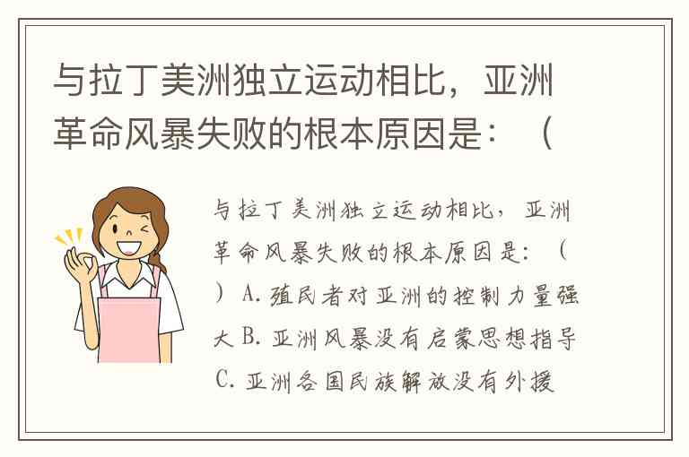 与拉丁美洲独立运动相比,亚洲革命风暴失败的根本原因是:() A.殖民者对亚洲的控制力量强大 B.亚洲风暴没有启蒙思想指导 C.亚洲各国民族解放没有外援 D.亚洲没有形成新经济关系