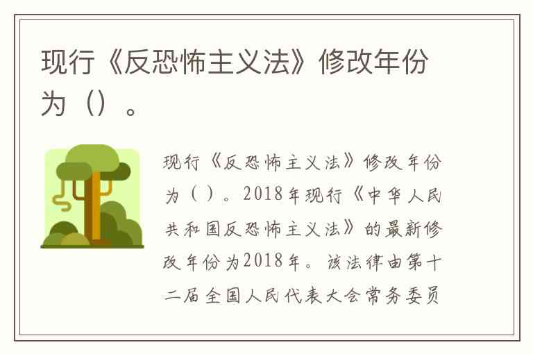 现行《中华人民共和国反恐怖主义法》的最新修改年份为2018年。该法律由第十二届全国人民代表大会常务委员会第十八次会议于2015年12月27日通过并公布,自2016年1月1日起施行。2018年4月27日,第十三届全国人民代表大会常务委员会第二次会议通过《关于修改〈中华人民共和国国境卫生检疫法〉等六部法律的决定》,对《反恐怖主义法》进行了修正。此次修正是国家根据反恐形势和法律实施情况,对相关条款作出的适应性调整,以进一步完善反恐怖主义法律体系。