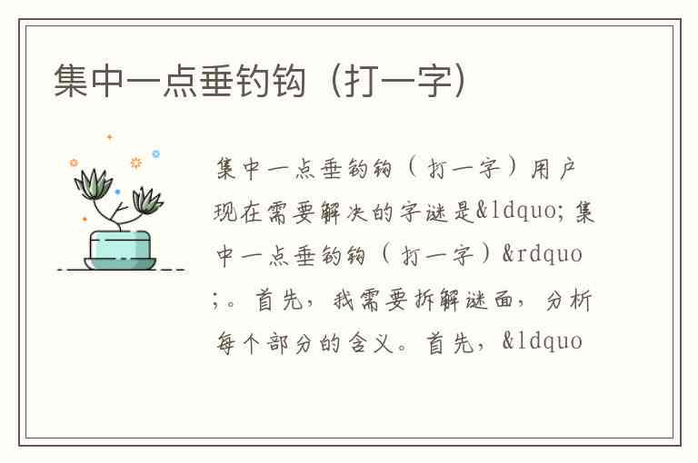 用户现在需要解决的字谜是“集中一点垂钓钩(打一字)”。首先,我需要拆解谜面,分析每个部分的含义。