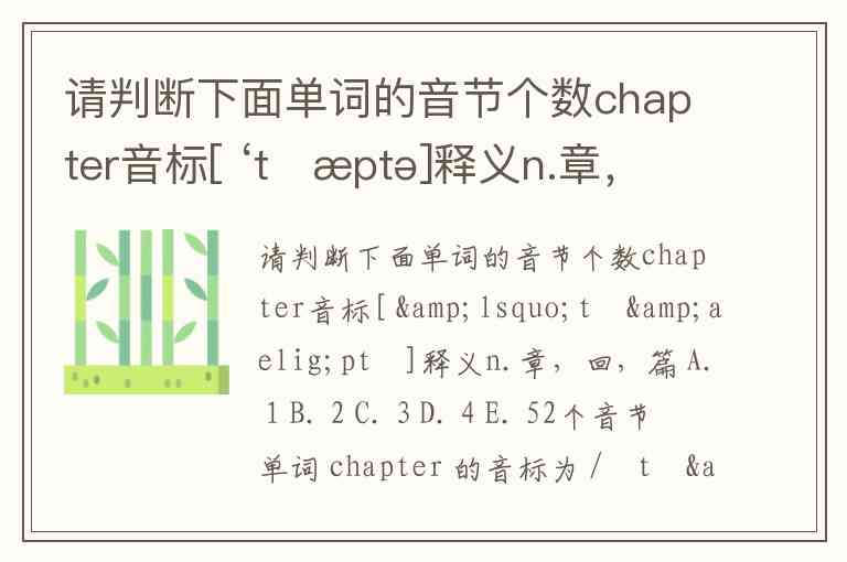 请判断下面单词的音节个数chapter音标[ ‘tʃæptə]释义n.章,回,篇 A. 1 B. 2 C. 3 D. 4 E. 5