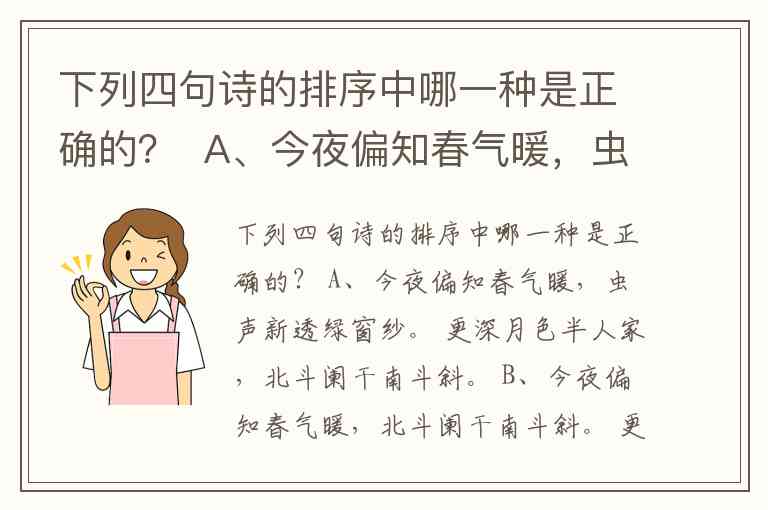 下列四句诗的排序中哪一种是正确的? A、今夜偏知春气暖,虫声新透绿窗纱。 更深月色半人家,北斗阑干南斗斜。 B、今夜偏知春气暖,北斗阑干南斗斜。 更深月色半人家,虫声新透绿窗纱。 C、更深月色半人家,北斗阑干南斗斜。 今夜偏知春气暖,虫声新透绿窗纱。 D、虫声新透绿窗纱,更深月色半人家。 今夜偏知春气暖,北斗阑干南斗斜。