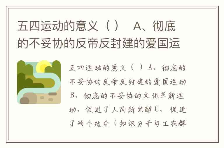 五四运动的意义( ) A、彻底的不妥协的反帝反封建的爱国运动 B、彻底的不妥协的文化革新运动,促进了人民新觉醒 C、 促进了两个结合(知识分子与工农群众,马义与工运),为中共成立做了准备 D、成为新旧民主革命的转折点,是新民主革命的伟大开端。