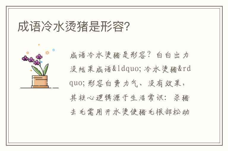 成语“冷水烫猪”形容白费力气、没有效果,其核心逻辑源于生活常识:杀猪去毛需用开水烫使猪毛根部松动,若用冷水则毫无作用,猪毛依旧顽固附着。这种“行动与目标完全背离”的场景,被引申为“付出努力却徒劳无功”的状态。