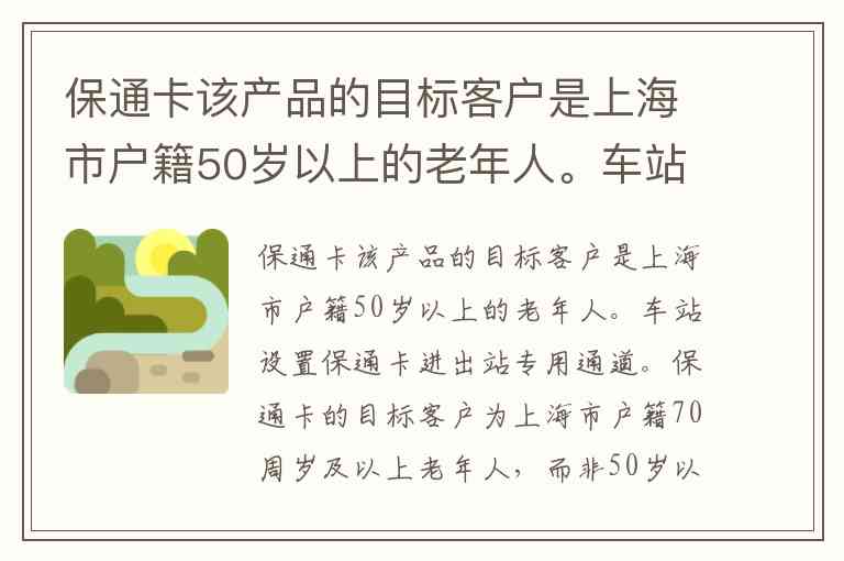 保通卡该产品的目标客户是上海市户籍50岁以上的老年人。车站设置保通卡进出站专用通道。