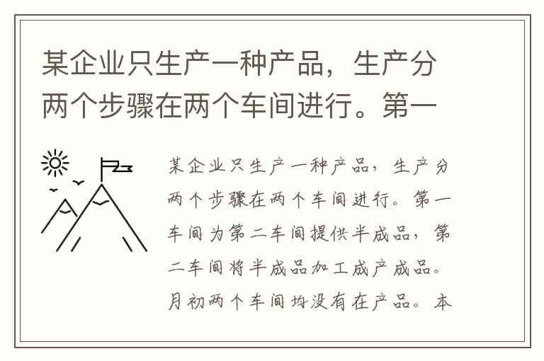 某企业只生产一种产品,生产分两个步骤在两个车间进行。第一车间为第二车间提供半成品,第二车间将半成品加工成产成品。月初两个车间均没有在产品。本月第一车间投产100件,有80件完工并转入第二车间,月末第一车间尚未加工完成的在产品相对于本步骤的完工程度为60%;第二车间完工50件,月末第二车间尚未加工完成的在产品相对于本步骤的完工程度为50%。该企业按照平行结转分步法计算产品成本,各生产车间按约当产量法在完工产品和在产品之间分配生产费用。月末第一车间的在产品约当产量为( )件。 A、12 B、27 C、42 D、50