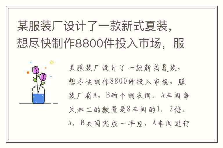 某服装厂设计了一款新式夏装,想尽快制作8800件投入市场,服装厂有A,B两个制衣间.A车间每天加工的数量是8车间的1.2倍。A,B共同完成一半后,A车间进行检修,B独立完成剩下的订单,结果这批订单共生产了32天交货,则A车间每天能生产多少件?