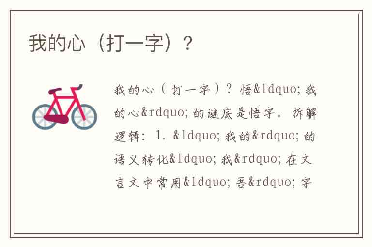 “悟”本义为“理解、觉醒”,暗合“心”的感知功能——“我的心”正是产生“领悟”的主体。这种从“自我之心”到“觉悟”的语义关联,让谜底不仅字形贴合,更增添了一层“心之所向,方有所悟”的哲思意味。