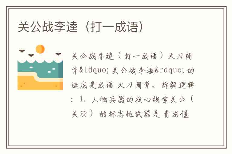 从青龙偃月刀的寒光到双斧挥舞的风声,这个谜语用“大刀阔斧”四个字,让千年前的英雄对决在文字中重现——兵器的碰撞声,恰是成语生命力的回响。
