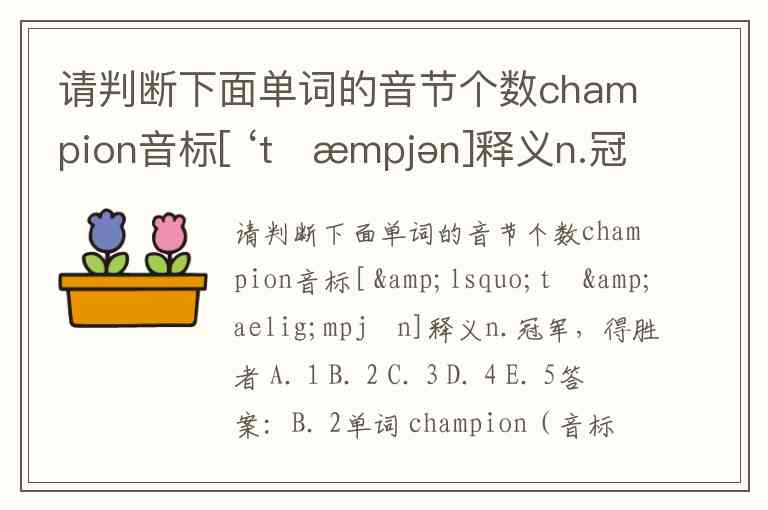 单词 champion(音标 /ˈtʃæmpjən/)的音节个数为 2个。