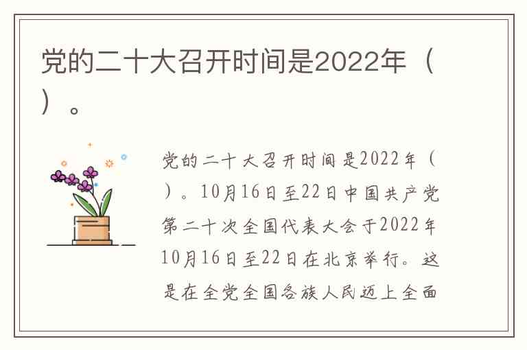 中国共产党第二十次全国代表大会于2022年10月16日至22日在北京举行。这是在全党全国各族人民迈上全面建设社会主义现代化国家新征程、向第二个百年奋斗目标进军的关键时刻召开的一次十分重要的大会。