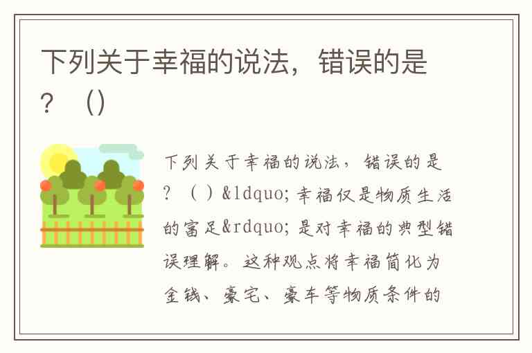 “幸福仅是物质生活的富足”是对幸福的典型错误理解。这种观点将幸福简化为金钱、豪宅、豪车等物质条件的累积,却忽视了幸福作为一种复杂心理体验的本质——它既包含客观环境因素,更依赖主观认知与精神追求的平衡。