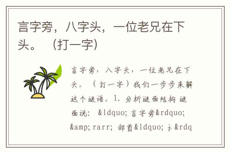 1. 分析谜面结构 谜面说: “言字旁” → 部首“讠” “八字头” → “八”在字的上面 “一位老兄在下头” → “老兄”可能指“兄”字,放在下面 2. 组合 “讠” + “八” + “兄” 如果“八字头”是在整个字的上部,那么可能是“讠”在左,“八”在上,“兄”在下。
