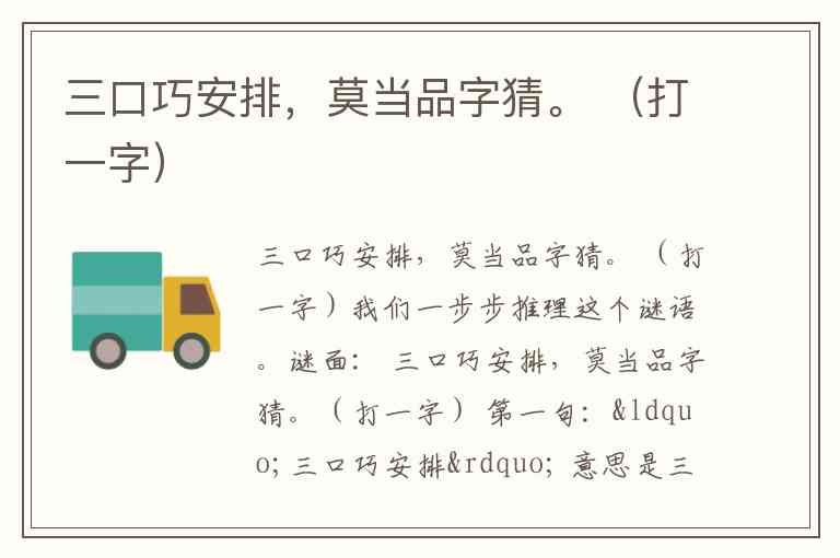 (打一字) 第一句:“三口巧安排” 意思是三个“口”字,不是简单堆成品字形(“品”字就是三个口直接组合)。