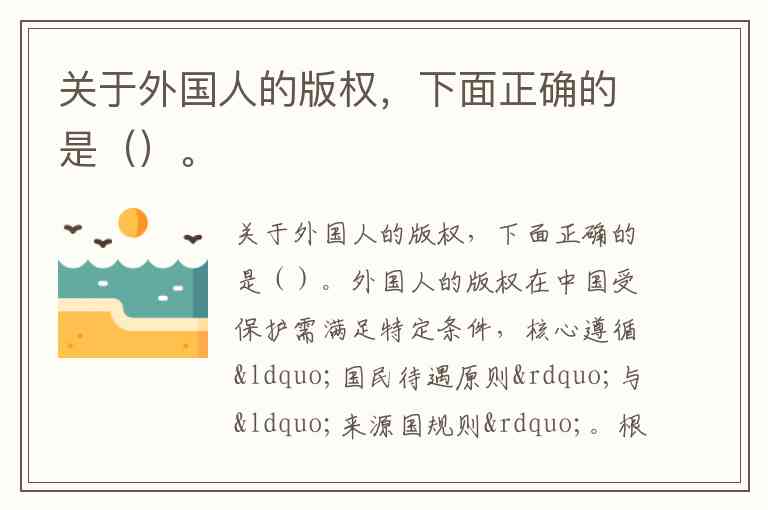 外国人的版权在中国受保护需满足特定条件,核心遵循“国民待遇原则”与“来源国规则”。根据中国《著作权法》及《伯尔尼公约》,以下三种情形的外国作品可获得保护: