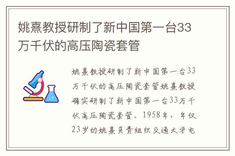 姚熹教授确实研制了新中国第一台33万千伏高压陶瓷套管。1958年,年仅23岁的姚熹负责组织交通大学电机系百余名学生到西安高压电瓷厂,承担研制我国第一台33万千伏高压电瓷套管项目。当时西安高压电瓷厂作为国家“一五”期间苏联援建的工程项目,尚未建成完工,苏联专家就已撤走,面对技术和生产设备几乎一片空白的严峻形势,他们与工厂技术人员和工人密切合作,开始了艰苦探索。