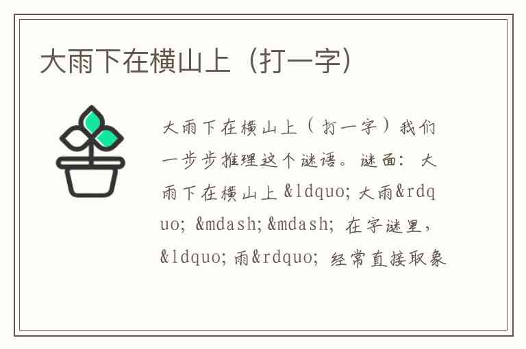 谜面:大雨下在横山上 “大雨” —— 在字谜里,“雨” 经常直接取象形或部首“雨”字头。