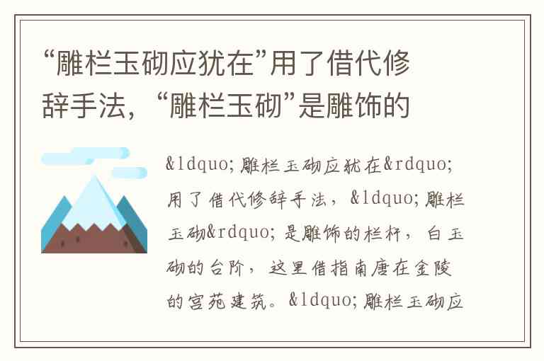 “雕栏玉砌应犹在”用了借代修辞手法,“雕栏玉砌”是雕饰的栏杆,白玉砌的台阶,这里借指南唐在金陵的宫苑建筑。