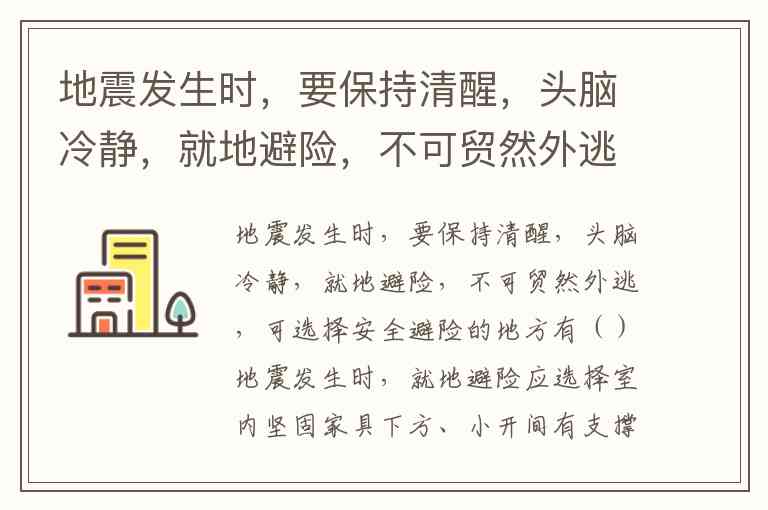 地震发生时,就地避险应选择室内坚固家具下方、小开间有支撑空间或室外开阔地带,具体包括: