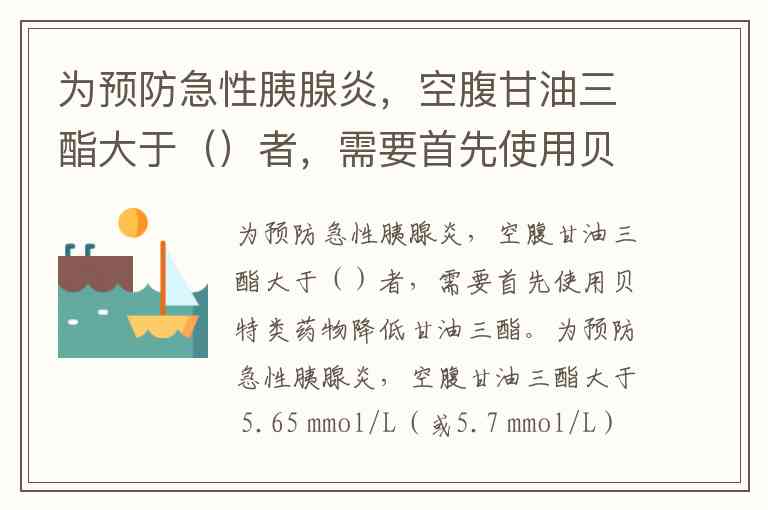 为预防急性胰腺炎,空腹甘油三酯大于 5.65 mmol/L(或5.7 mmol/L) 者需首先使用贝特类药物降低甘油三酯。这一阈值基于多项临床研究和指南共识,是平衡风险控制与治疗收益的关键节点。