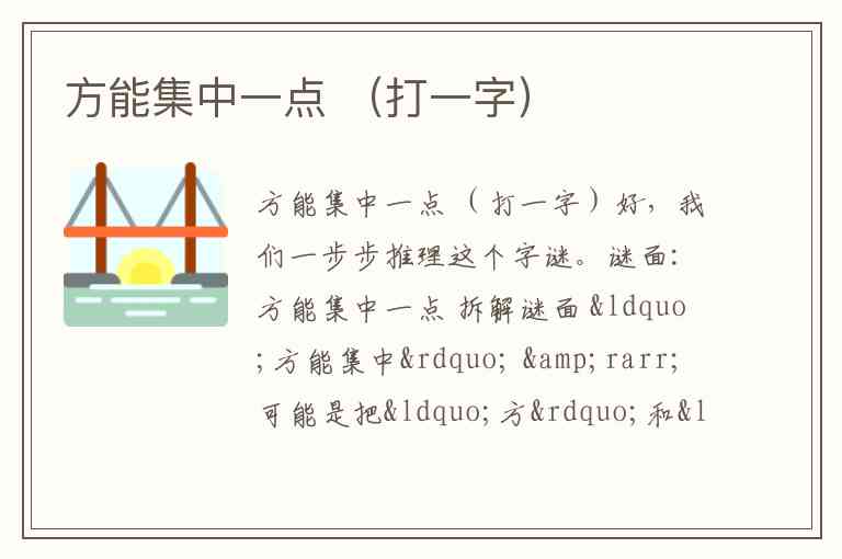 谜面:方能集中一点 拆解谜面 “方能集中” → 可能是把“方”和“集”两个字的中部或中心部分取出来。