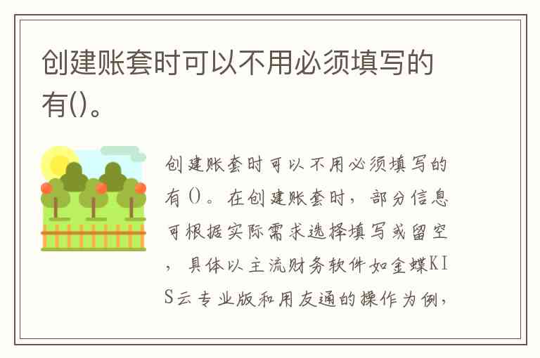 在创建账套时,部分信息可根据实际需求选择填写或留空,具体以主流财务软件如金蝶KIS云专业版和用友通的操作为例,非必须填写项主要包括单位简称、数据库路径说明性文字及非核心基础信息,具体如下: