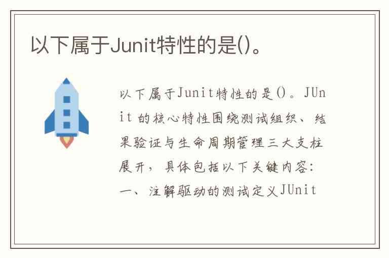 JUnit 的核心特性围绕测试组织、结果验证与生命周期管理三大支柱展开,具体包括以下关键内容: