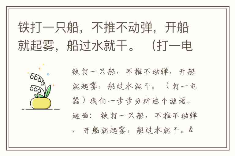 谜面: 铁打一只船,不推不动弹, 开船就起雾,船过水就干。
