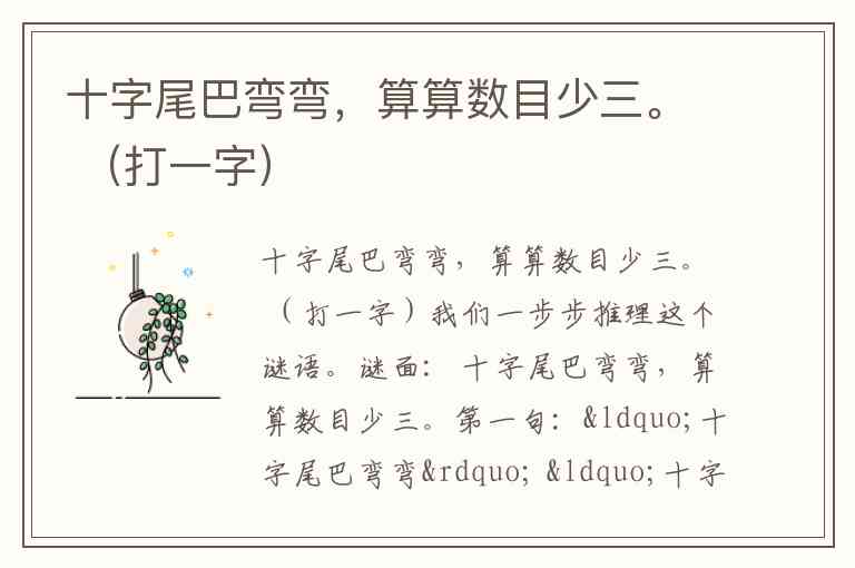 结论: 谜面“十字尾巴弯弯”是形容“七”的形状像“十”但竖笔下部弯弯,“算算数目少三”提示“七”比“十”少三。