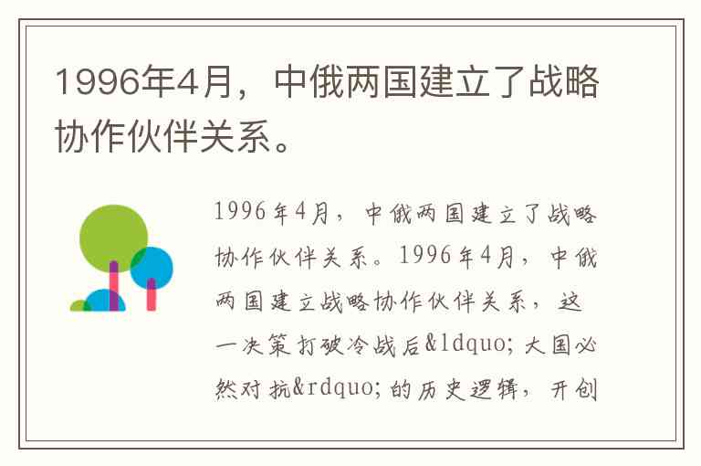 1996年4月,中俄两国建立了战略协作伙伴关系。