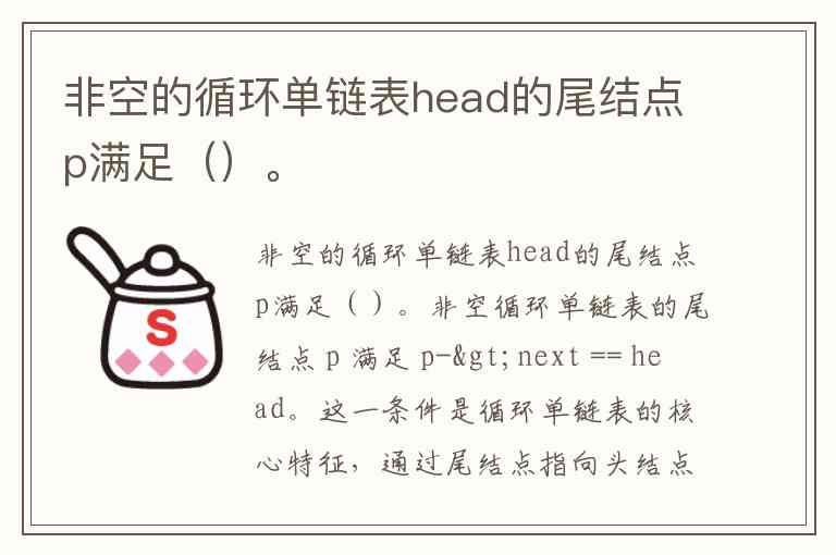 非空循环单链表的尾结点 p 满足 p->next == head。这一条件是循环单链表的核心特征,通过尾结点指向头结点形成逻辑闭环,使链表从“线性结构”转化为“环形结构”。
