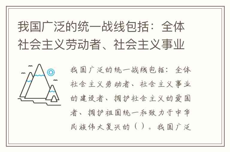我国广泛的统一战线包括:全体社会主义劳动者、社会主义事业的建设者、拥护社会主义的爱国者、拥护祖国统一和致力于中华民族伟大复兴的爱国者。这一表述由2018年宪法修正案明确,将“致力于中华民族伟大复兴的爱国者”纳入统一战线范围,标志着爱国统一战线从“爱国一家”向“复兴一体”的历史拓展,覆盖人群达14亿多中国人民和海外全体中华儿女。