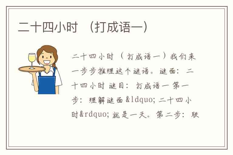 谜面:二十四小时 谜目:打成语一 第一步:理解谜面 “二十四小时”就是一天。