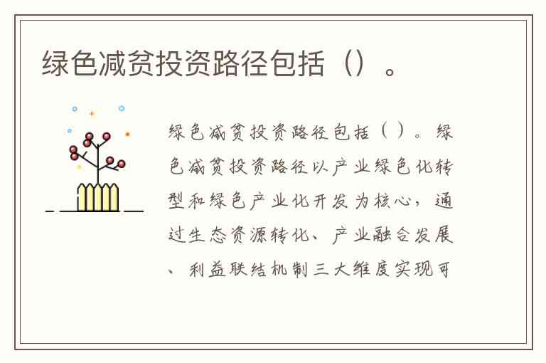 绿色减贫投资路径以产业绿色化转型和绿色产业化开发为核心,通过生态资源转化、产业融合发展、利益联结机制三大维度实现可持续减贫,既保护生态环境又带动经济增收。