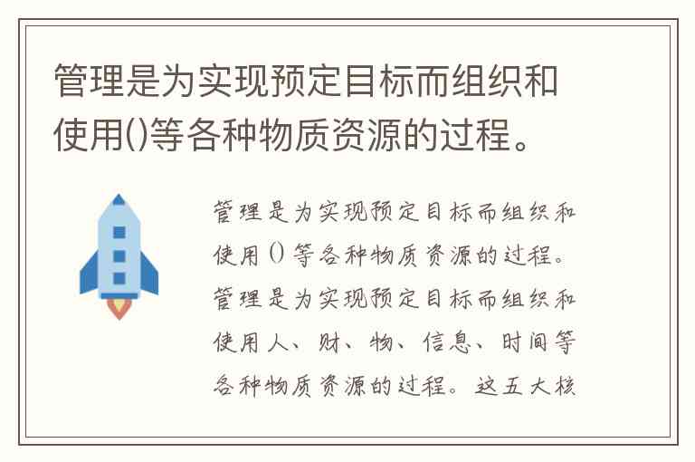 管理是为实现预定目标而组织和使用人、财、物、信息、时间等各种物质资源的过程。这五大核心要素构成管理活动的基础框架,其配置效率直接决定目标达成的质量与效率。