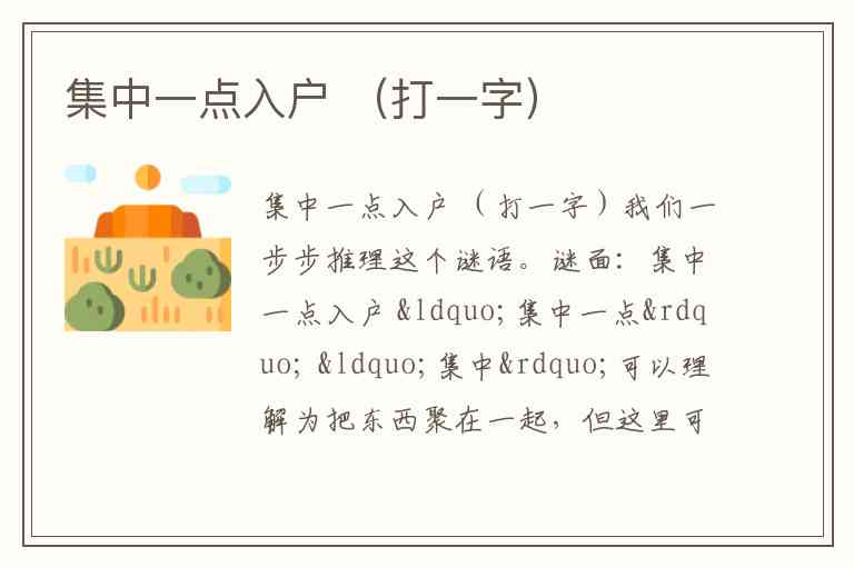 谜面:集中一点入户 “集中一点” “集中”可以理解为把东西聚在一起,但这里可能拆字。