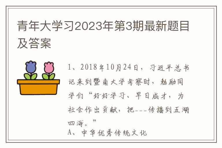 1、2018年10月24日,习近平总书记来到暨南大学考察时,勉励同学们“好好学习、早日成才,为社会作出贡献,把___传播到五湖四海。”