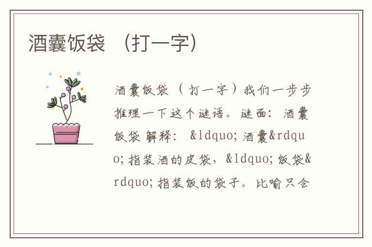 另一种常见谜底: “酒囊”= 酉 + 囊(象形?) “饭袋”= 食 + 袋 但更常见的谜语答案是“泡”或“包”吗?不对。