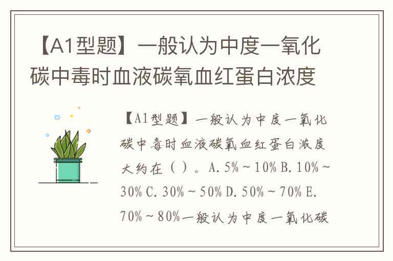 【A1型题】一般认为中度一氧化碳中毒时血液碳氧血红蛋白浓度大约在()。A.5%~10% B.10%~30% C.30%~50% D.50%~70% E.70%~80%