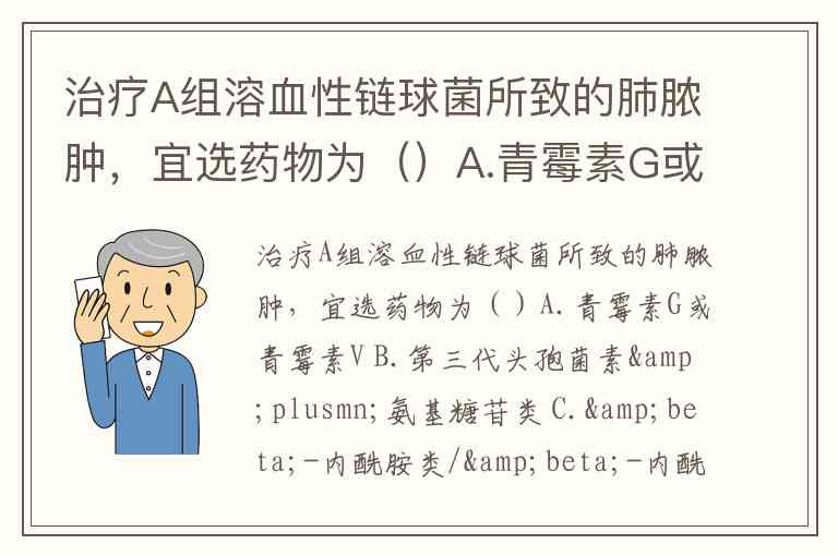 治疗A组溶血性链球菌所致的肺脓肿,宜选药物为()A.青霉素G或青霉素V B.第三代头孢菌素±氨基糖苷类 C.β-内酰胺类/β-内酰胺酶抑制剂 D.氨曲南+甲硝唑 E.糖肽类+磷霉素