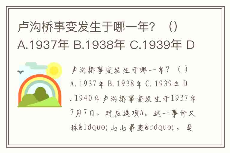 卢沟桥事变发生于哪一年?()A.1937年 B.1938年 C.1939年 D.1940年