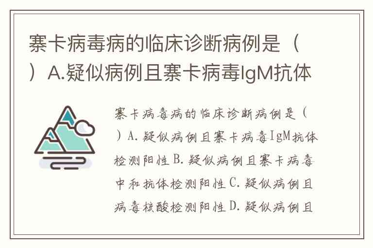 寨卡病毒病的临床诊断病例是()A.疑似病例且寨卡病毒IgM抗体检测阳性 B.疑似病例且寨卡病毒中和抗体检测阳性 C.疑似病例且病毒核酸检测阳性 D.疑似病例且病毒抗原检测阳性 E.疑似病例且分离出寨卡病毒