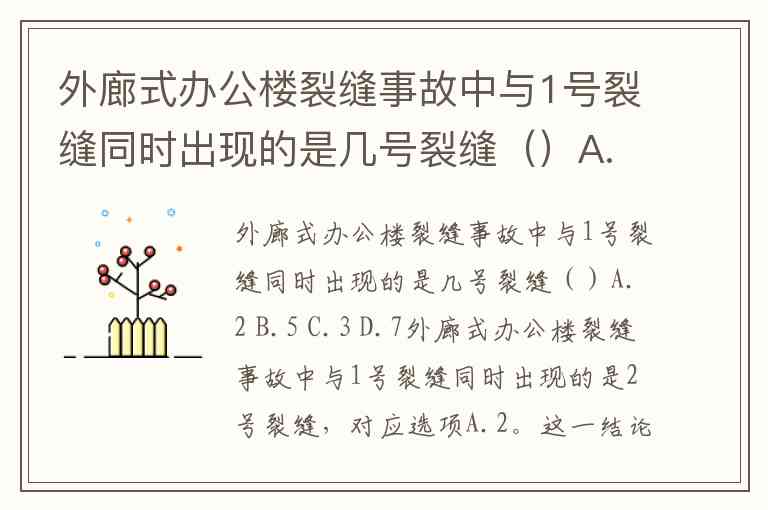 外廊式办公楼裂缝事故中与1号裂缝同时出现的是2号裂缝,对应选项A.2。这一结论在结构工程事故案例分析中具有明确依据,反映了建筑物受力裂缝的同步性特征。