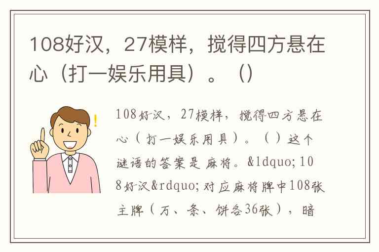 “108好汉”对应麻将牌中108张主牌(万、条、饼各36张),暗合《水浒传》108将的典故;“27模样”指麻将的3种花色(万、条、饼)各有9个数字,3×9=27种不同牌面;“搅得四方悬在心”既描绘了四人围坐打麻将的场景(四方),又暗示游戏过程中的紧张悬念。三者共同指向这一传统棋牌娱乐用具。