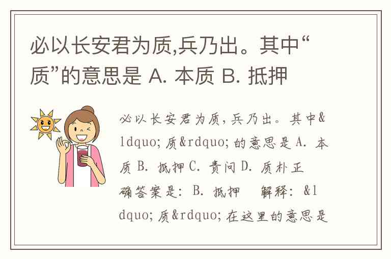 必以长安君为质,兵乃出。其中“质”的意思是 A. 本质 B. 抵押 C. 责问 D. 质朴