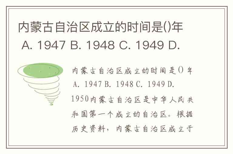 内蒙古自治区成立的时间是()年 A. 1947 B. 1948 C. 1949 D. 1950