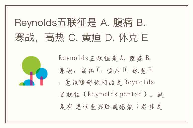 你问的是 Reynolds 五联征(Reynolds pentad)。这是在 急性重症胆道感染(尤其是急性胆管炎) 中描述的经典临床表现,用于提示病情严重、可能合并 败血症或休克。