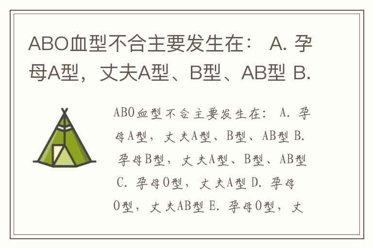 ABO血型不合主要发生在: A. 孕母A型,丈夫A型、B型、AB型 B. 孕母B型,丈夫A型、B型、AB型 C. 孕母O型,丈夫A型 D. 孕母O型,丈夫AB型 E. 孕母O型,丈夫A型、B型、AB型